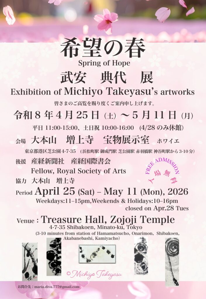 【書画作品展覧会のご案内】 武安典代(平6中文卒) この度、増上寺にて、武安典代展「希望の春」を開催いたします。ご予定があうお日にちがございましたらば、是非ご高覧戴けましたら幸いに存じます。 日時:令和8年4月25日〜5月11日 会場:大本山 増上寺 宝物展示室 ホワイエ※入場無料 ↑クリックすると大きな画像になります